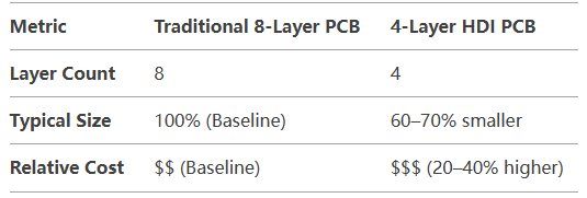 虽然由于专业工艺,HDI 制造涉及更高的前期成本,但层数和电路板尺寸的减少通常会抵消这些费用。例如,将 8 层标准 PCB 转换为 4 层 HDI 设计可以将材料成本降低 25-30%,使其成为大批量生产的明智选择。